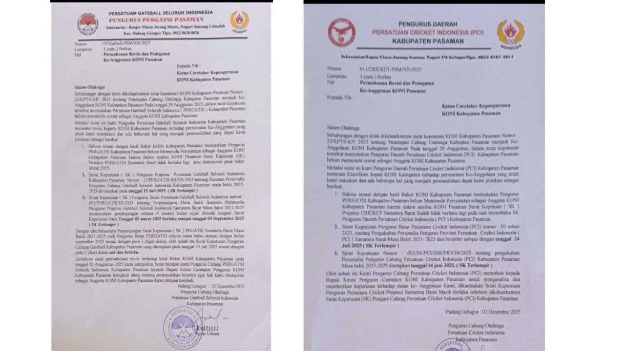 Pasaman, hantaran.Co— Dua organisasi cabang olahraga di Kabupaten Pasaman, yakni Persatuan Gateball Seluruh Indonesia (Pergatsi) dan Persatuan Cricket Indonesia (PCI), secara resmi mengajukan permohonan revisi dan penegasan status keanggotaan mereka kepada Komite Olahraga Nasional Indonesia (KONI) Kabupaten Pasaman. Permohonan tersebut disampaikan melalui dua surat terpisah yang masing-masing ditujukan kepada Ketua Caretaker KONI Pasaman pada 2 Desember 2025.