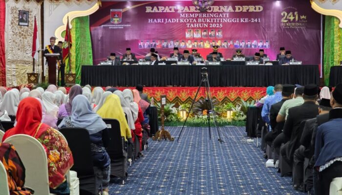 Puncak peringatan Hari Jadi Kota (HJK) Bukittinggi ke 241 dilaksanakan melalui Rapat Paripurna DPRD Bukittinggi di Balai Sidang Bung Hatta, Senin (22/12/2025).