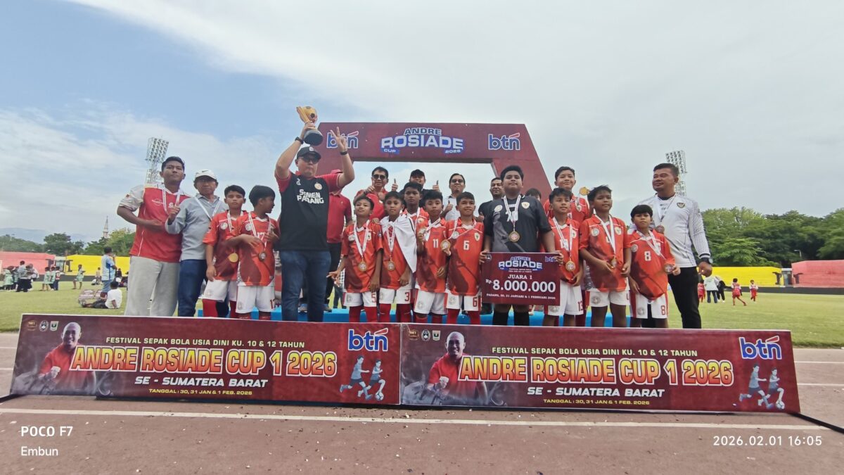 Padang, hantaran.Co–Sekolah Sepakbola (SSB) Griya Elok untuk kelompok umur (KU) 10 tahun dan Padang Peduli untuk kelompok umur 12 tahun berhasil menjuarai festival sepakbola Andre Rosiade Cup 1 yang digelar di Stadion H. Agus Salim Padang pada 30 Januari hingga 1 Februari 2026.