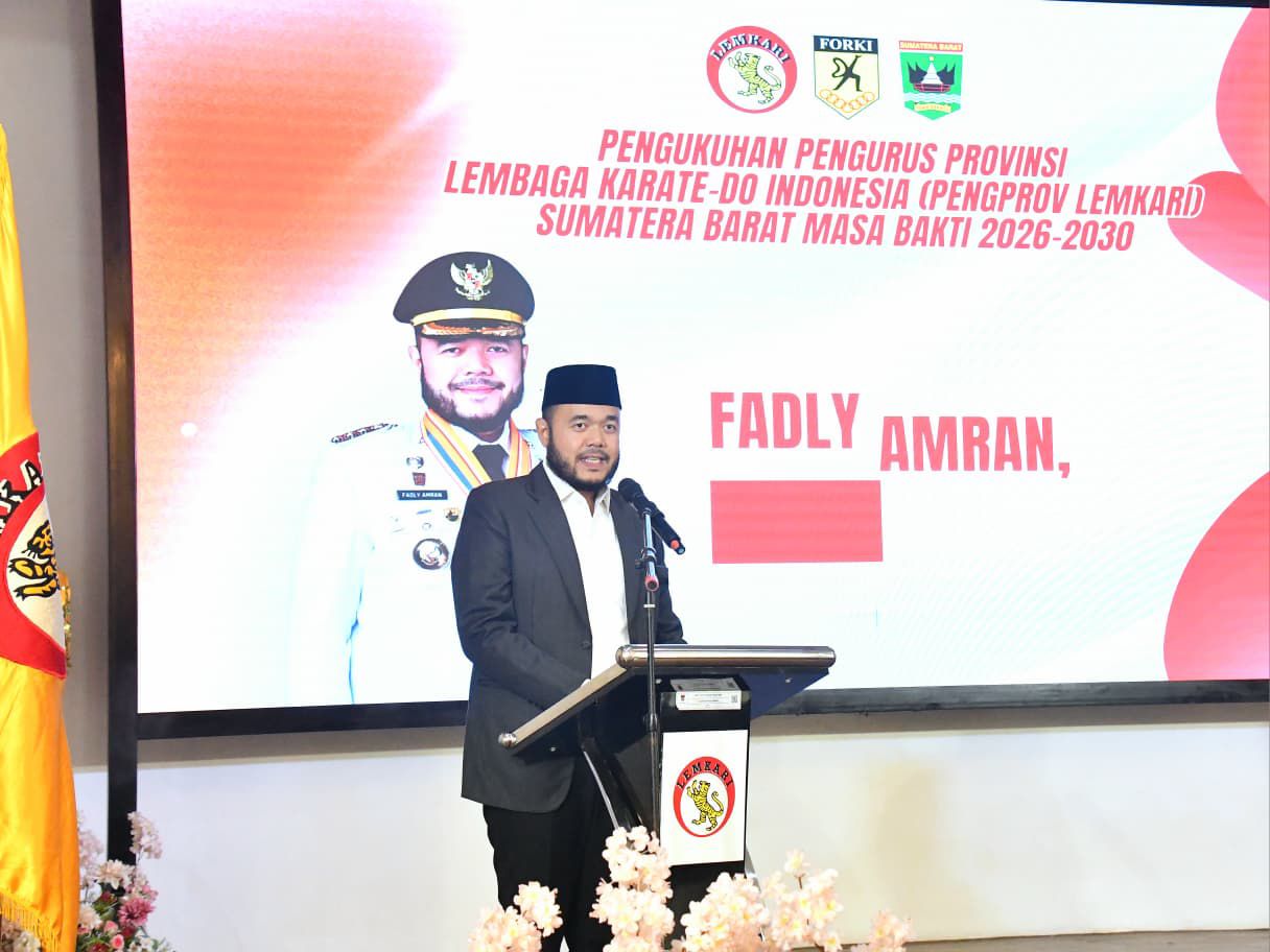 Padang, hantaran.Co–Wali Kota Padang, Fadly Amran, menghadiri pengukuhan Pengurus Provinsi (Pengprov) Lembaga Karate-Do Indonesia (Lemkari) Sumatera Barat (Sumbar) masa bakti 2026-2030 yang berlangsung di Gedung Bagindo Aziz Chan Youth Center, Minggu (1/2/2026).