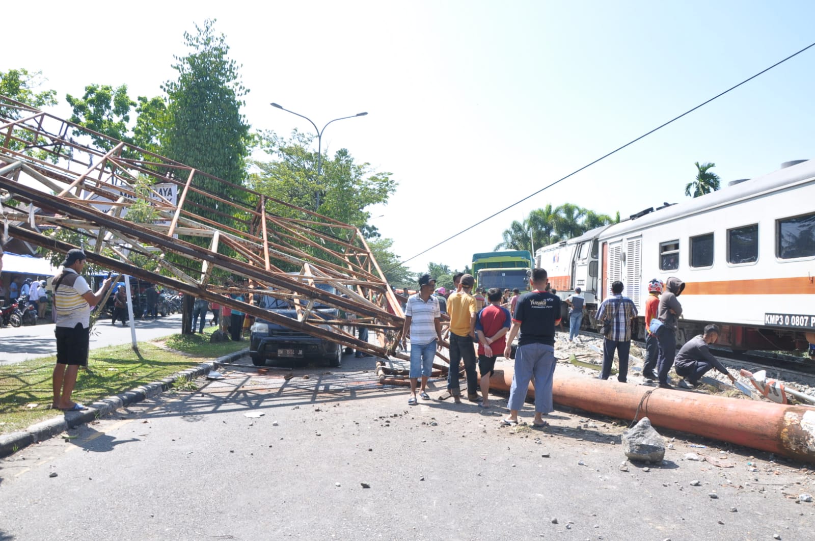 “Truk datang dari arah Simpang Anak Air, ketika melintasi rel, ternyata kereta api sedang melaju, truk sempat terseret beberapa meter dan menghantam tiang baliho yang langsung roboh menimpa mobil minibus,” ucapnya.