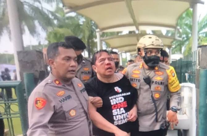 Terlihat wajah Ade Armando babak belur hingga mengeluarkan darah saat dievakuasi oleh petugas kepolisian.