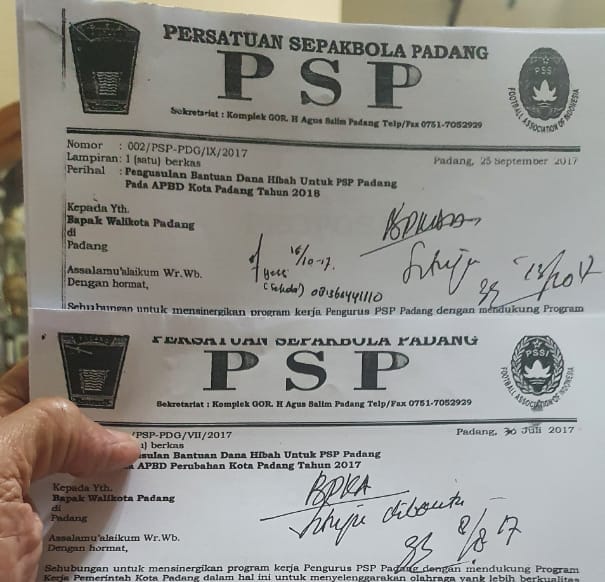 Surat Ketua PSP kepada Wali Kota Padang, kata dia, didisposisikan kepada Kepala BPKAD Andri Yulika karena telah setuju dibantu oleh Wali Kota Padang. Atas perintah Ketua PSP, Agus Suardi pun berkoordinasi dengan Andri Yulika via WhatsApp demi tim PSP bisa dibantu pendanaannya melalui dana hibah.