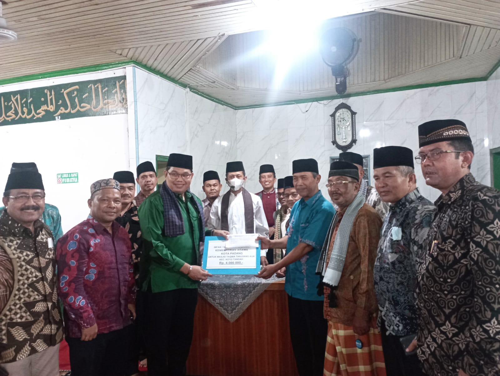 Tim menyerahkan infak keluarga besar Kankemenag Padang kepada Masjid Taqwa yang diterima Ketua Masjid Tomas. Infak sebesar Rp 4 juta dan bantuan Al Quran.