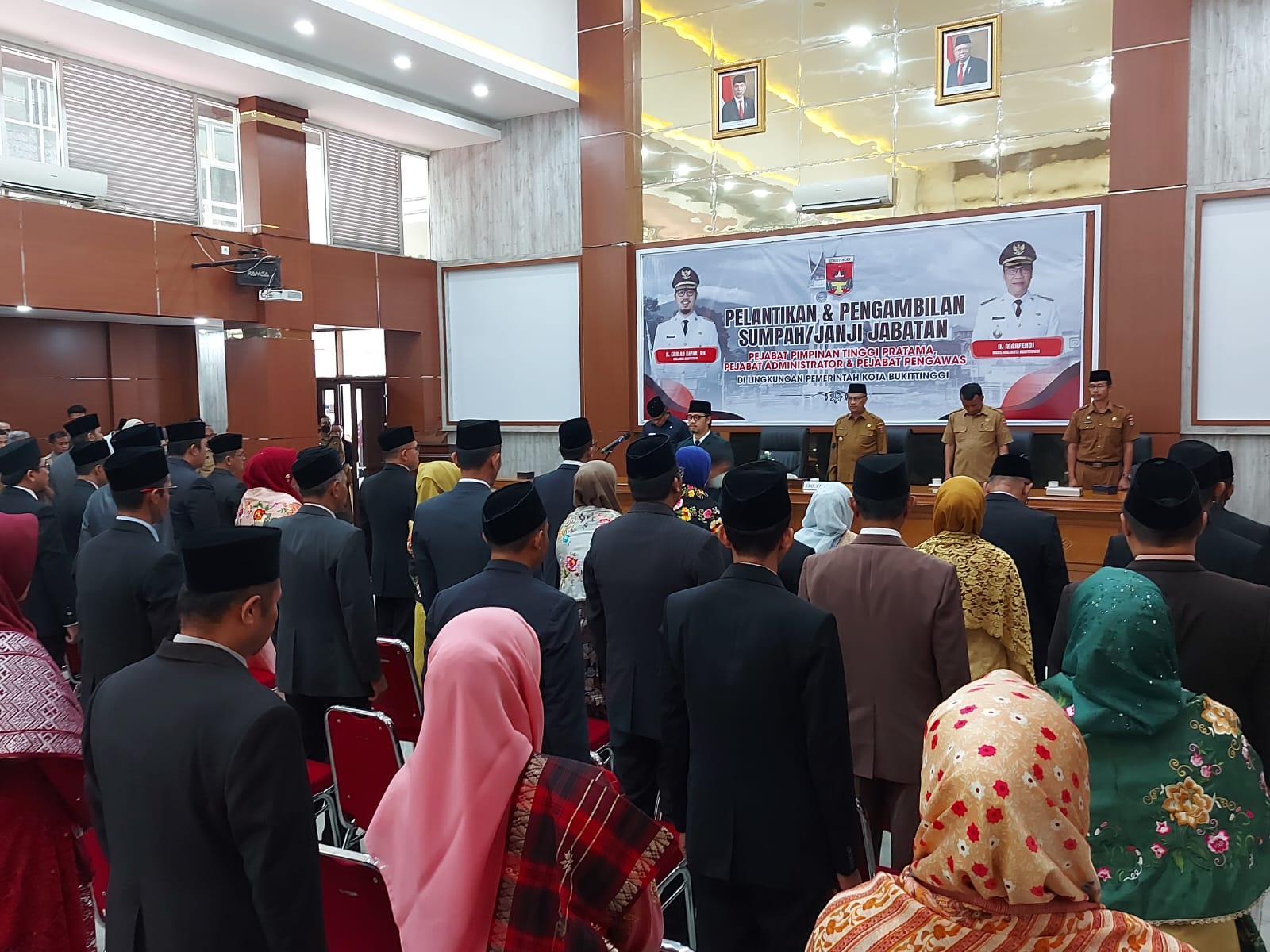 BUKITTINGGI, hantaran.co – Wali Kota Bukittinggi Erman Safar melantik sebanyak 49 orang pejabat di lingkungan Pemko Bukittinggi yang terdiri dari Pejabat Pimpinan Tinggi Pratama, Pejabat Administrator dan Pejabat Pengawas. Pelantikan dan pengambilan sumpah dilaksanakan di Aula Balaikota, Senin (27/6).