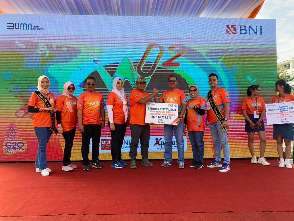 PADANG, hantaran.co — Pada acara ulang tahun Bank Negara Indonesia (BNI) ke -76, Komandan Lanud Kolonel Pnb M.R.Y Fahlefie, S.Sos., psc didampingi Ketua Yasrini Cabang Lanud Sutan Sjharir Ny. Fifi M.R.Y Fahlefie Dalam acara Fun Walk Bank Negara Indonesia (BNI) 46 menerima bantuan CSR untuk Rehab sekolah SMP Angkasa Lanud Sut sebesar Rp. 114.731673, Padang, (15/7/2022).