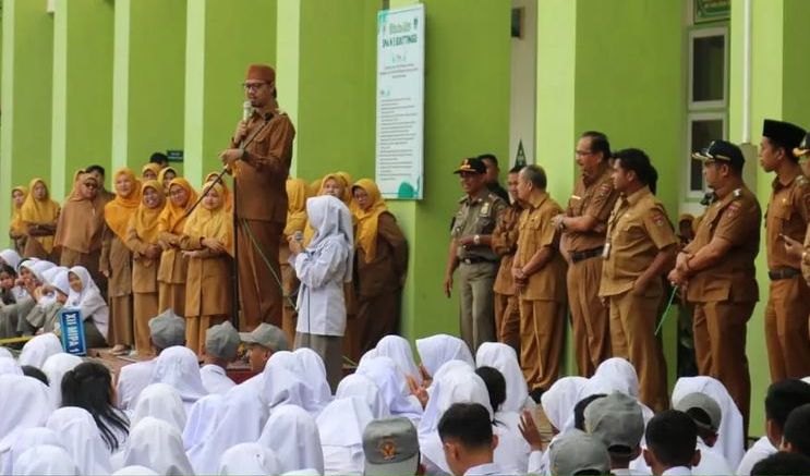 BUKITTINGGI, hantaran.co – Wali Kota Bukittinggi Erman Safar kunjungi SMAN 5 Bukittinggi, Senin(25/7). Berkumpul bersama seluruh siswa dan guru sekolah tersebut di lapangan utama, Wako berpesan agar siswa dapat mengikuti perkembangan zaman, seperti zaman sekarang yang sudah serba digital.