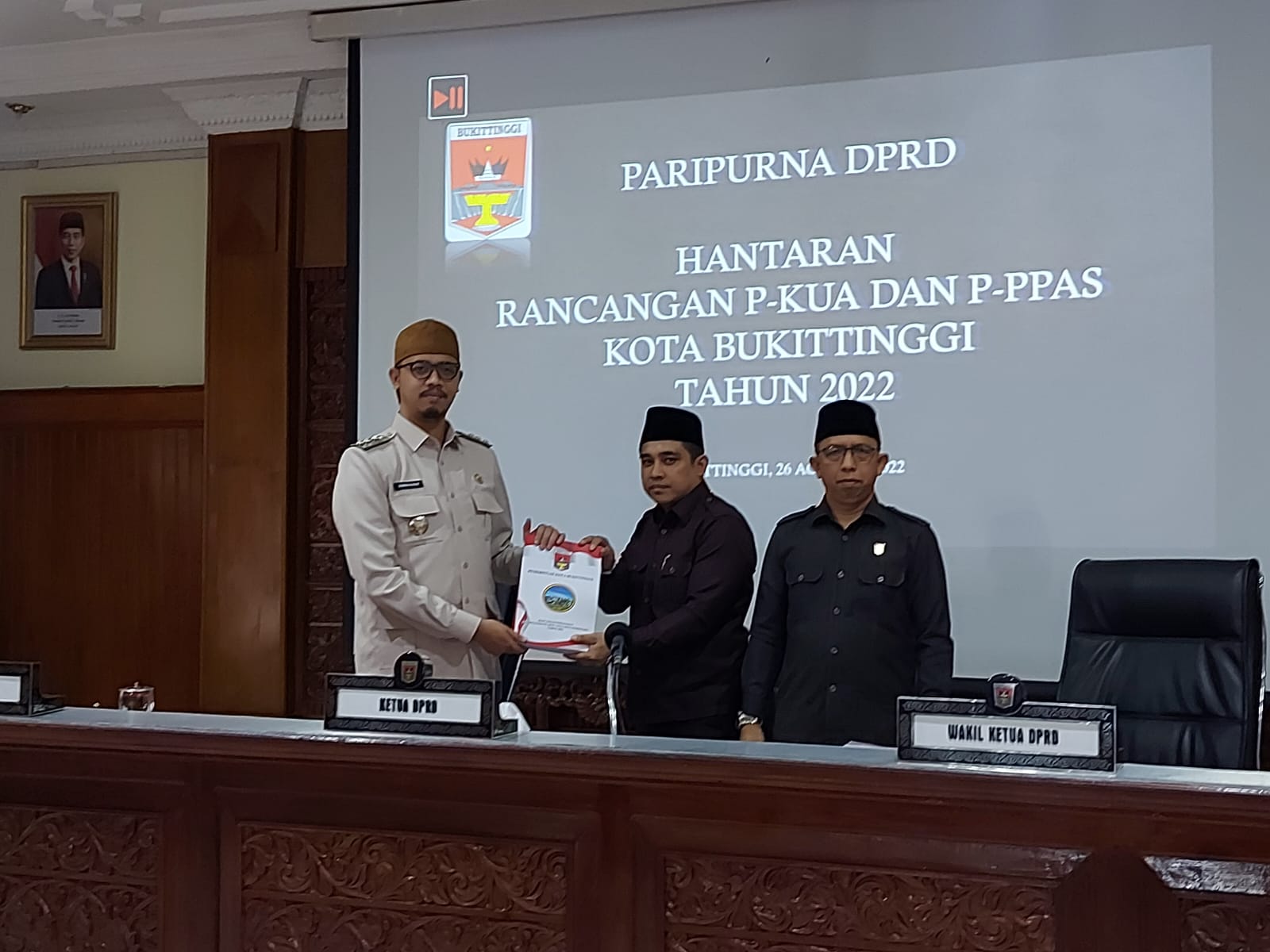BUKITTINGGI, hantaran.co – Wali Kota Bukittinggi hantarkan rancangan perubahan Kebijakan Umum Anggaran (KUA) dan rancangan perubahan Prioritas Plafon Anggaran Sementara (PPAS) APBD 2022 dalam rapat paripurna DPRD Bukittinggi di gedung dewan setempat,Jumat (26/08).