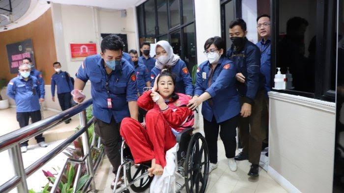 Hasnaeni keluar dari Gedung Bundar Kejagung dengan memakai rompi tahanan khas Kejagung warna pink dan menggunakan kursi roda dan infus di tangannya.