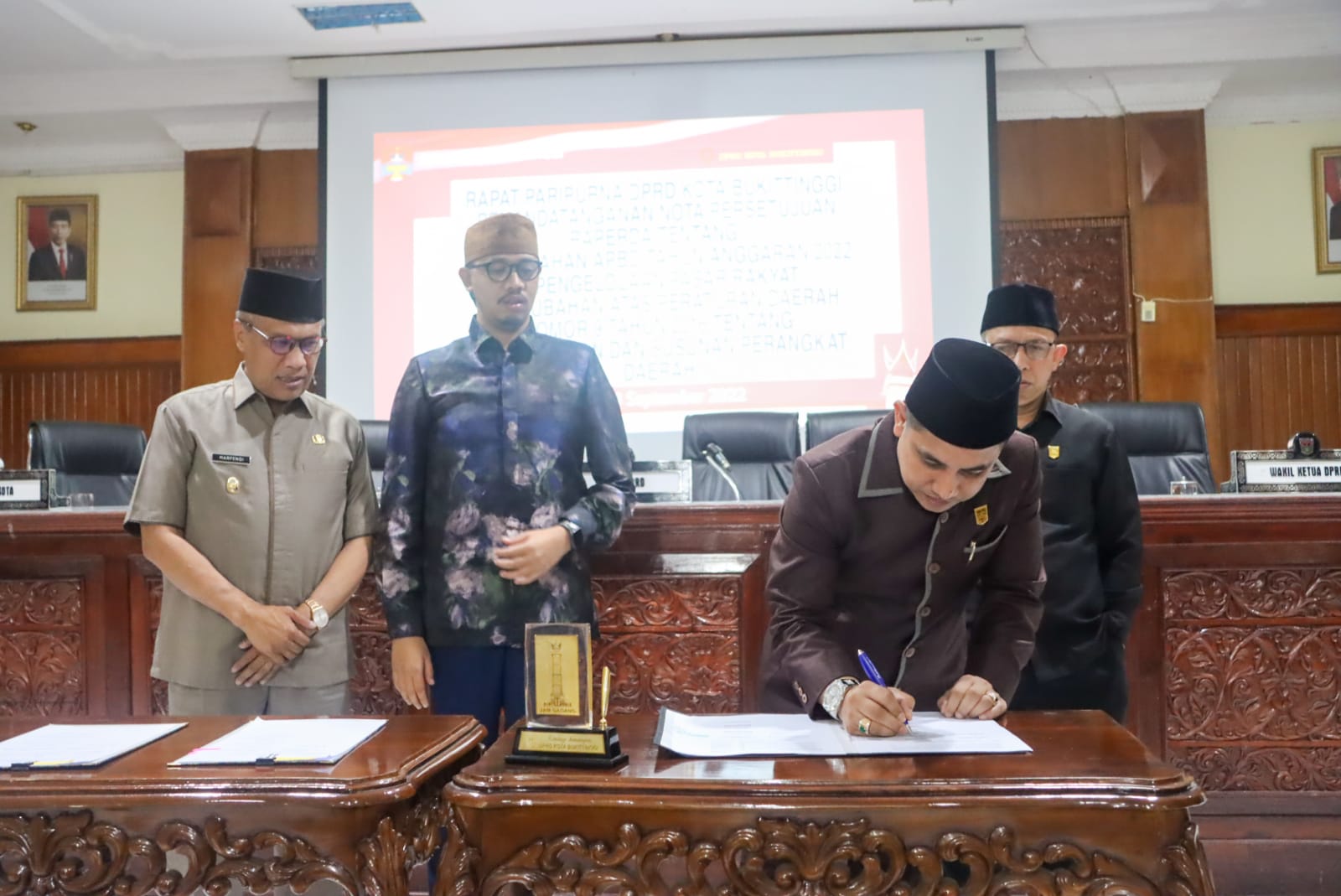 Persetujuan tiga ranperda itu dilakukan dalam rapat paripurna DPRD Bukittinggi di gedung dewan setempat, Jumat (23/9) malam. Dengan agenda penandatanganan nota persetujuan bersama terhadap ranperda perubahan APBD tahun anggaran 2022, ranperda pengelolaan pasar rakyat, dan ranperda perubahan atas Perda Nomor 9 tahun 2016 tentang pembentukan dan susunan perangkat daerah.