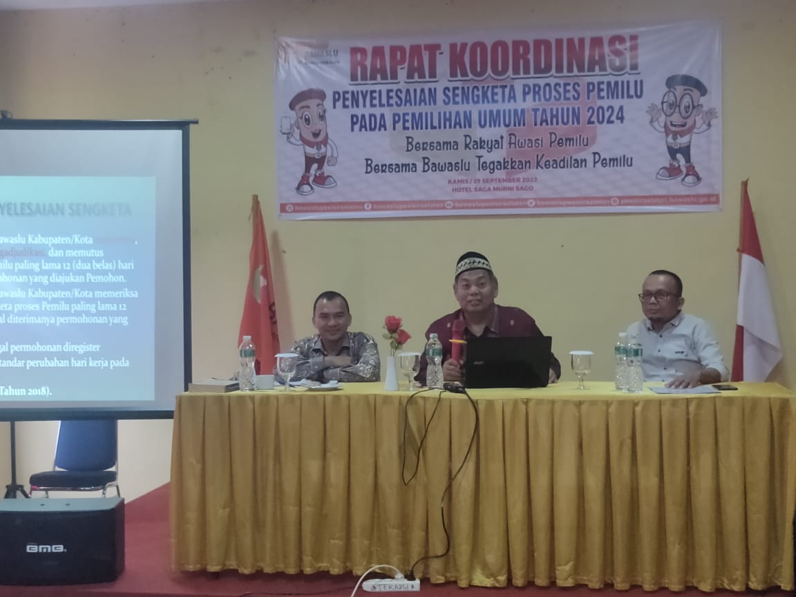PESSEL, hantaran.co – Badan Pengawas Pemilihan Umum (Bawaslu), Kabupaten Pesisir Selatan, Sumatera Barat menggelar rapat koordinasi fasilitasi penyelenggaraan penyelesaian sengketa proses pemilu tahun 2024. Bertempat di hotel Saga Murni, Kamis (29/9/2022).