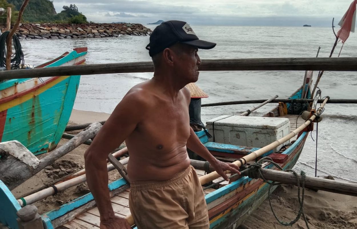 Ujang yang diketahui memiliki 6 orang anak ini, terlihat lesu sembari bermenung di perahu miliknya yang terparkir di pinggir pantai. Sesekali pria paruh baya ini menatap ke langit yang tampak mendung. Betapa tidak, kebutuhan melaut di tengah kenaikan harga BBM tidak sebanding lagi dengan penghasilan yang ia dapat sepulang dari melaut.
