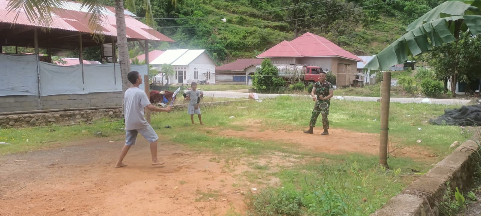 Dengan memanfaatkan peralatan dan lapangan seadanya, prajurit Kodim 0311/Pessel ini terlihat bersemangat bermain badminton bersama warga.