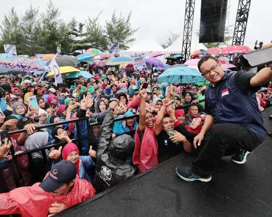 Pada kesempatan itu, Anies pun terlihat menyapa pendukungnya dengan payung di tangan mereka. Berswafoto sembari bersalam-salaman rasanya sudah cukup mengobati kerinduan untuk bertemu langsung dengan calon presiden idola mereka.