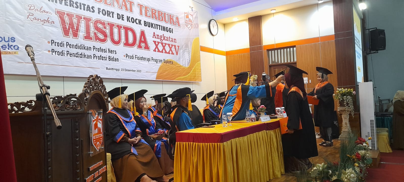 BUKITTINGGI, hantaran.co Universitas Fort De Kock kembali mewisuda lulusannya. Kali ini wisuda angkatan ke XXXV diikuti sebanyak 64 wisudawati terdiri dari Program Studi (Prodi) Pendidikan Profesi Ners sebanyak 43 orang, Prodi Pendidikan Profesi Bidan sebanyak 19 orang dan Prodi Fisioterai 1 orang.