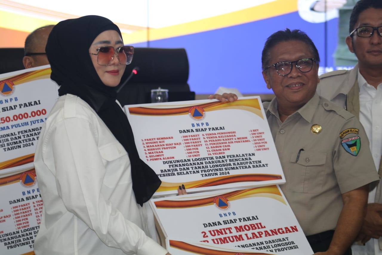 PADANG, hantaran.co – Badan Nasional Penanggulangan Bencana (BNPB) menyerahkan bantuan kepada Anggota DPR RI Lisda Hendrajoni untuk disalurkan kepada masyarakat Kabupaten Pesisir Selatan (Pessel) yang terdampak bencana banjir dan longsor beberapa waktu lalu. Bantuan tersebut diterima secara simbolis oleh Kepala Pelaksana (Kalaksa) BPBD Pessel, Doni Gusrizal bertempat di pendopo rumah dinas Gubernur Sumatera Barat (Sumbar).