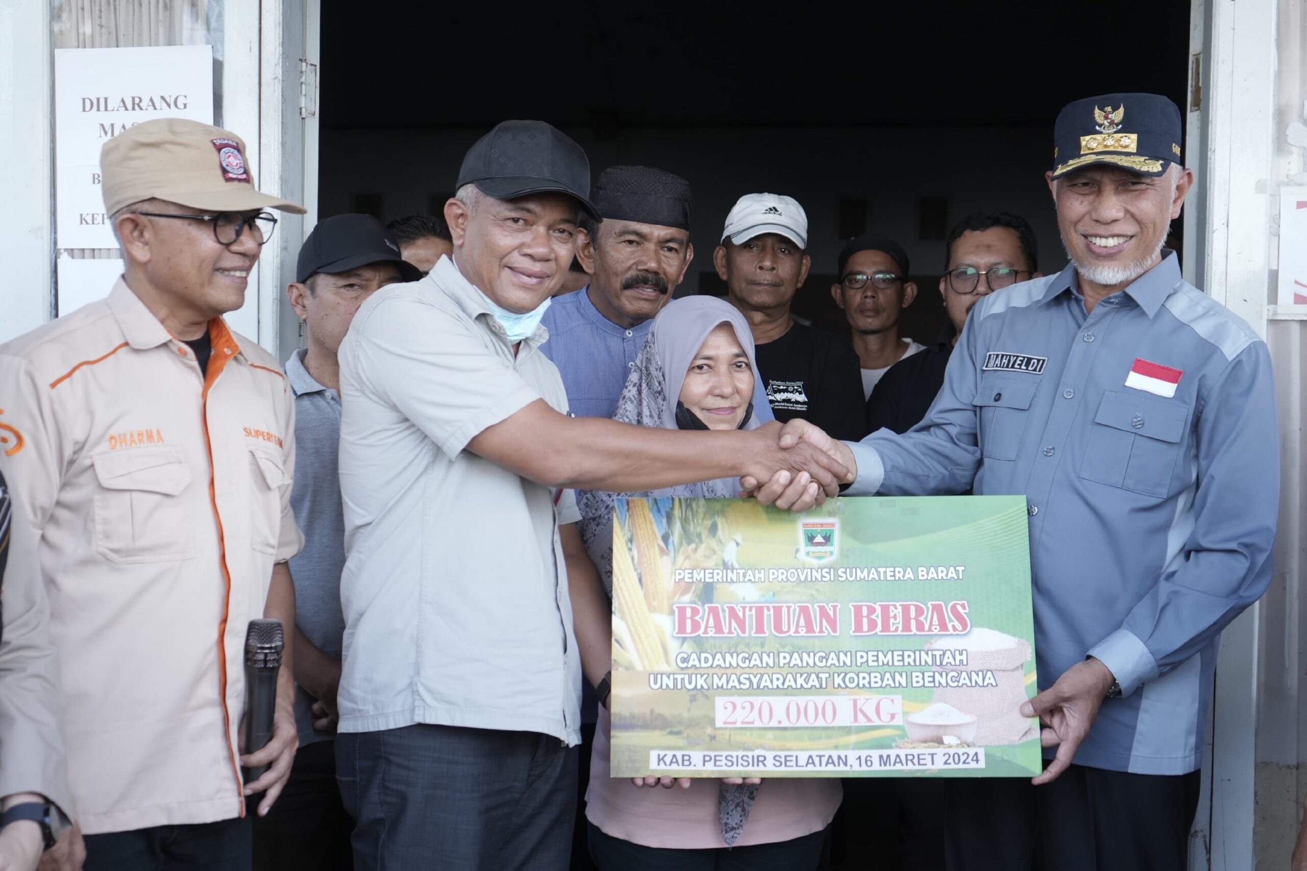 Pesisir Selatan, hantaran.co – Gubernur Sumatera Barat, Mahyeldi menyalurkan bantuan beras Cadangan Pangan Pemprov (CPP) Sumbar sebanyak 220 ton untuk masyarakat yang terdampak bencana di Kabupaten Pesisir Selatan (Pessel), Sabtu (16/3/2024).