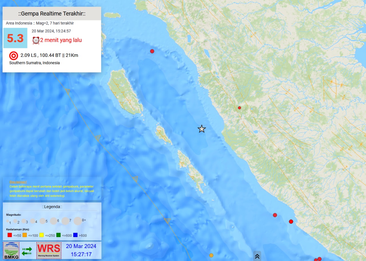 Berdasarkan informasi BMKG, gempa mengguncang Pesisir Selatan berkekuatan magnitudo 5,3 itu berlangsung pada pukul 15:24:57 WIB.