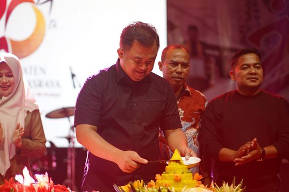 Pada kesempatan itu, Sutan Riska didampingi Ketua TP PKK Ny. Dewi Sutan Riska diiringi lagu Selamat Ulang Tahun milik Band Jamrud memotong tempeng dan menyerahkannya kepada Ketua DPRD.