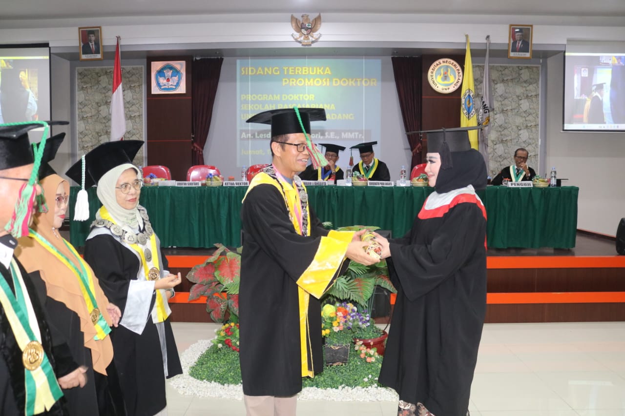 PADANG, hantaran.co – Lisda Hendrajoni dinyatakan sah menyandang gelar doktor di bidang ilmu pendidikan setelah memperoleh IPK 3,87 dan predikat sangat memuaskan dalam ujian terbuka yang digelar secara offline oleh Universitas Negeri Padang (UNP) di aula lantai 3 Sekolah Pascasarjana UNP, Jumat (17/5).