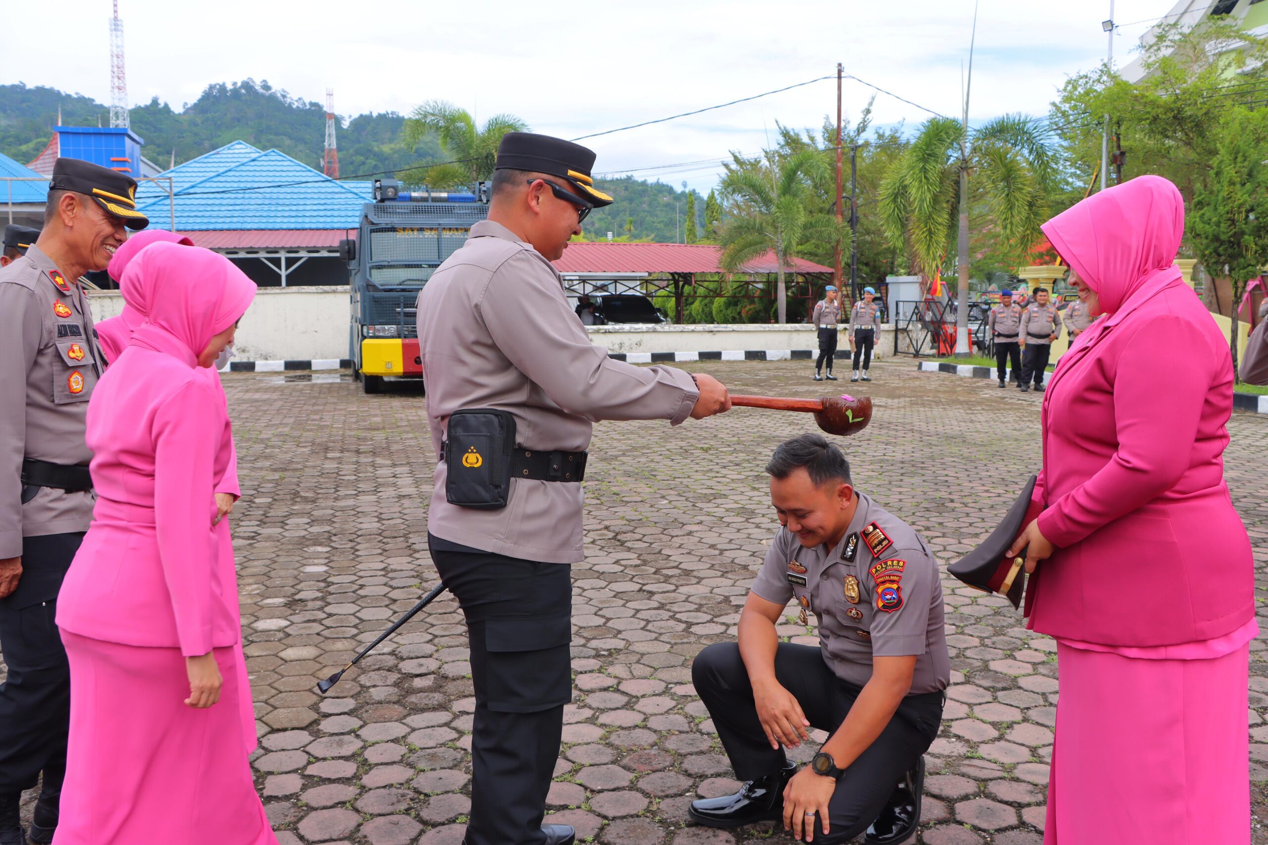 Dalam upacara itu, satu orang naik pangkat dari Inspektur Polisi Satu (Iptu) menjadi Ajun Komisaris Polisi (AKP).