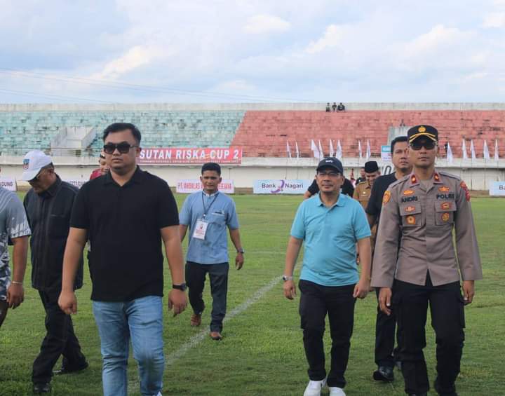 DHARMASRAYA, HANTARAN. CO – Usai laksanakan pembukaan Sutan Riska (SR) Cup II, Senin (27/5/24) di Gelanggang Olahraga Sport Center Dharmasraya, Bupati Dharmasraya Sutan Riska Tuanku Kerajaan selaku penyelenggara turun langsung dalam pembukaan turnamen bola kaki ini.