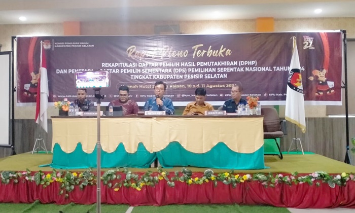 Pesisir Selatan, hantaran.co – Komisi Pemilihan Umum (KPU) Kabupaten Pesisir Selatan mengadakan Rapat Pleno Terbuka untuk Rekapitulasi Daftar Pemilih Hasil Pemutakhiran (DPHP) dan Penetapan Daftar Pemilih Sementara (DPS) di Hotel Hannah Painan, Minggu (11/8).