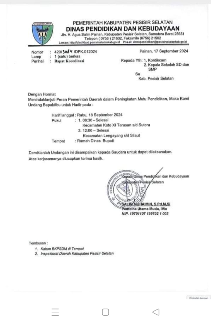Pesisir Selatan – Lagi-lagi jagat maya dihebohkan dengan beredarnya surat undangan rapat koordinasi dari Kepala Dinas Pendidikan dan Kebudayaan Kabupaten Pesisir Selatan, Salim Muhaimin. Surat tertanggal 17 September 2024 tersebut, ditujukan kepada Kepala Sekolah SD dan SMP beserta Kordikcam se-Kabupaten Pesisir Selatan.