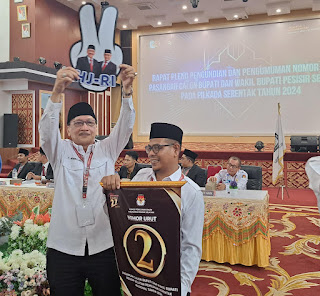 Pesisir Selatan – Komisi Pemilihan Umum (KPU) Kabupaten Pesisir Selatan (Pessel), menetapkan nomor urut dua pasangan calon (paslon) Bupati dan Wakil Bupati peserta Pilkada 2024 di daerah setempat.