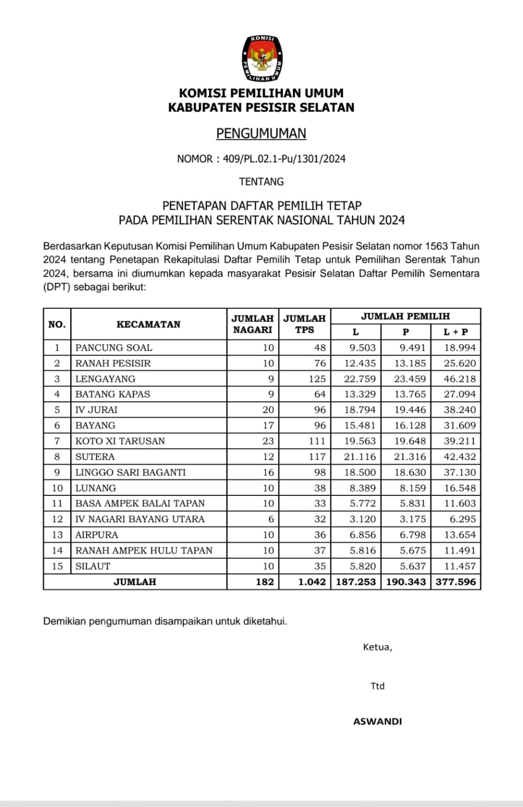 Pesisir Selatan– Komisi Pemilihan Umum (KPU) Kabupaten Pesisir Selatan resmi menetapkan Daftar Pemilih Tetap (DPT) untuk Pemilihan Serentak Nasional 2024.
