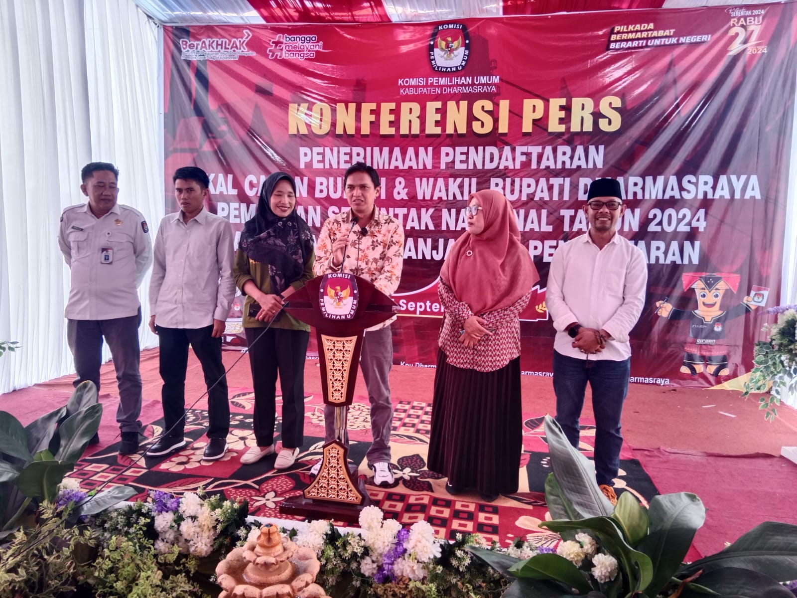 DHARMASRAYA, HANTARAN, CO – Komisi Pemilihan Umum (KPU) Kabupaten Dharmasraya kembali membuka pintu pendaftaran bagi bakal calon (Balon) Bupati dan Wakil Bupati masa perpanjangan. Hal ini, disampaikan Ketua KPU Dharmasraya France Putra didampingi komisioner lainnya , Wilri Iswandi, Henny Wardany, Hanna Citra Utami TB, John Indra dan Sekretaris KPU Dharmasraya Amrullah, saat jumpa Pers di kantor KPU setempat, Senin (2/9/24).