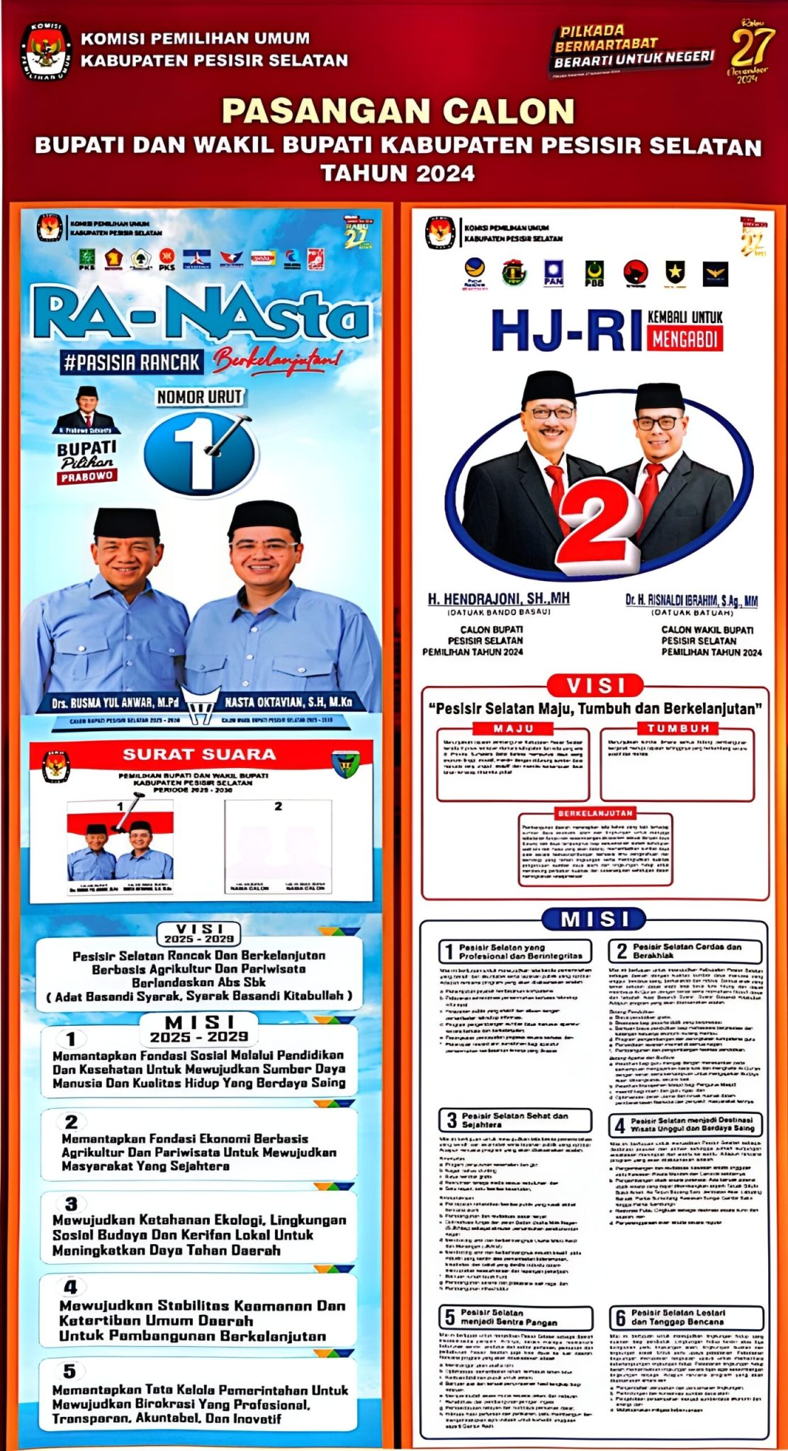 Pesisir Selatan – Pemilihan Kepala Daerah (Pilkada) Kabupaten Pesisir Selatan tahun 2024 akan digelar pada tanggal 27 November 2024. Pilkada kali ini diikuti dua pasangan calon (Paslon) Bupati dan Wakil Bupati Pesisir Selatan.