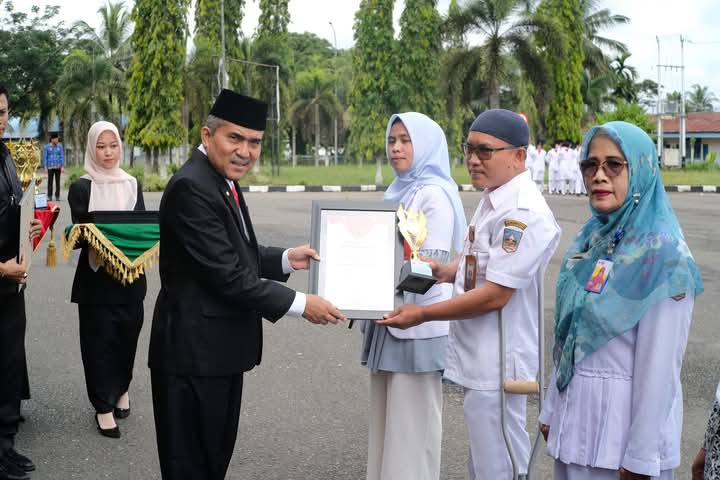DHARMASRAYA, HANTARAN.CO – Bupati Dharmasraya, Sutan Riska Tuanku Kerajaan yang diwakili oleh Sekda Dharmasraya, Adlisman bertindak sebagai Pemimpin Upacara pada Peringatan Hari Pahlawan ke-79 Tahun 2024 dan Hari Kesehatan Nasional ke-60. Upacara ini dilaksanakan di halaman kantor Bupati Dharmasraya, Minggu (10/11/24).