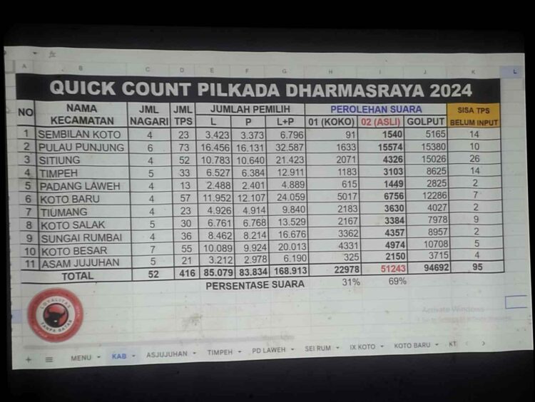 Meski penghitungan suara di TPS se-Kabupaten Dharmasraya belum tuntas, namun hasil hitungan cepat kemenangan nomor urut 2 tersebut mencapai 69 persen. Hingga berita ini ditayangkan, TPS yang belum tuntas penghitungan suara ada sekitar 95 TPS.