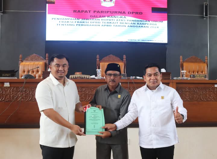 Dharmasraya, Hantaran. Co – Pandangan umum yang disampaikan oleh tujuh Fraksi DPRD pada rapat paripurna Jum’at, 20 September 2024 kemaren memberikan informasi, masukan serta saran terkait Perubahan APBD Kabupaten Dharmasraya yang menjadi representasi dari harapan dan keinginan dari masyarakat. Dari hasil pandangan Fraksi DPRD tersebut Bupati Dharmasraya Sutan Riska Tuanku Kerajaan,S.E,M.A.P sampaikan jawaban sampaikan jawaban pada rapat paripurna yang diselenggarakan di Ruang Rapat Utama DPRD Kabupaten Dharmasraya. Sabtu,(21/09/2024).