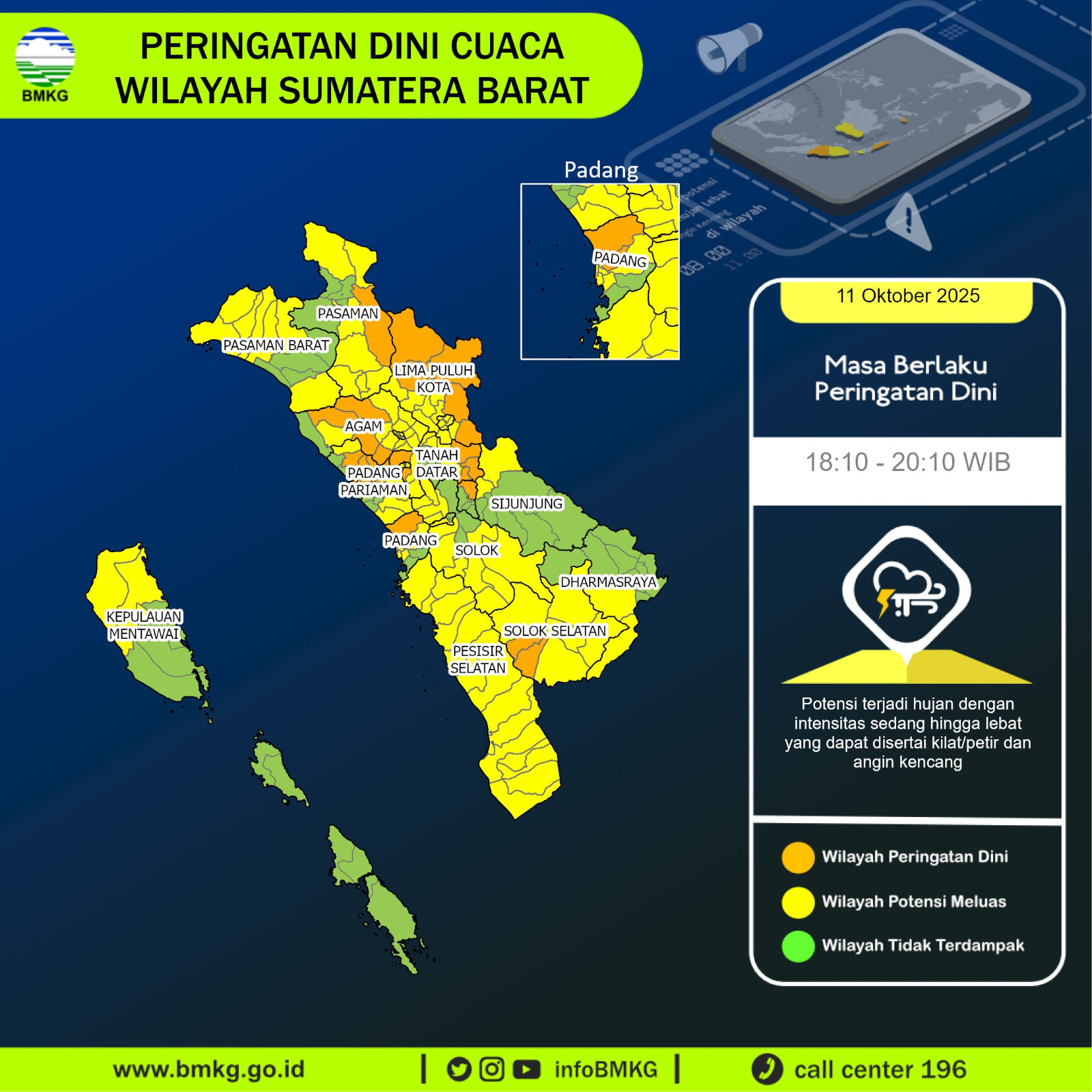 PADANG, HANTARAN.CO – Badan Meteorologi, Klimatologi, dan Geofisika (BMKG) mengeluarkan update peringatan dini cuaca untuk wilayah Sumatera Barat, termasuk Kota Padang, pada Sabtu (11/10/2025) pukul 18.00 WIB.