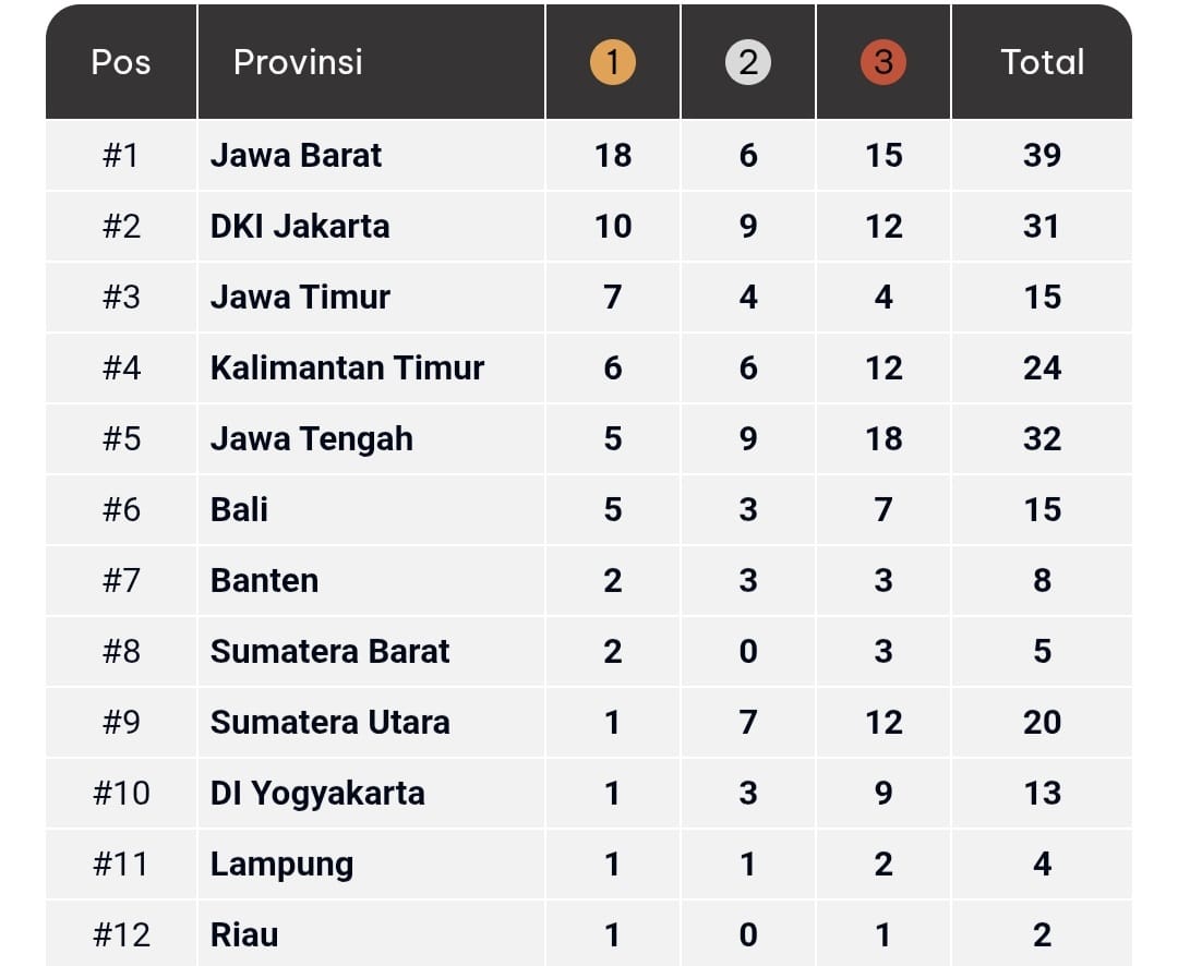 Sementara posisi teratas masih jadi milik Jawa Barat dengan raihan 18 emas, enam perak, 15 perunggu. Peringkat kedua diikuti DKI Jakarta dengan 10, sembilan perak 12 perunggu, dan posisi le tiga jadi milik Jawa Timur dengan tujuh emas, empat perak, empat perunggu.