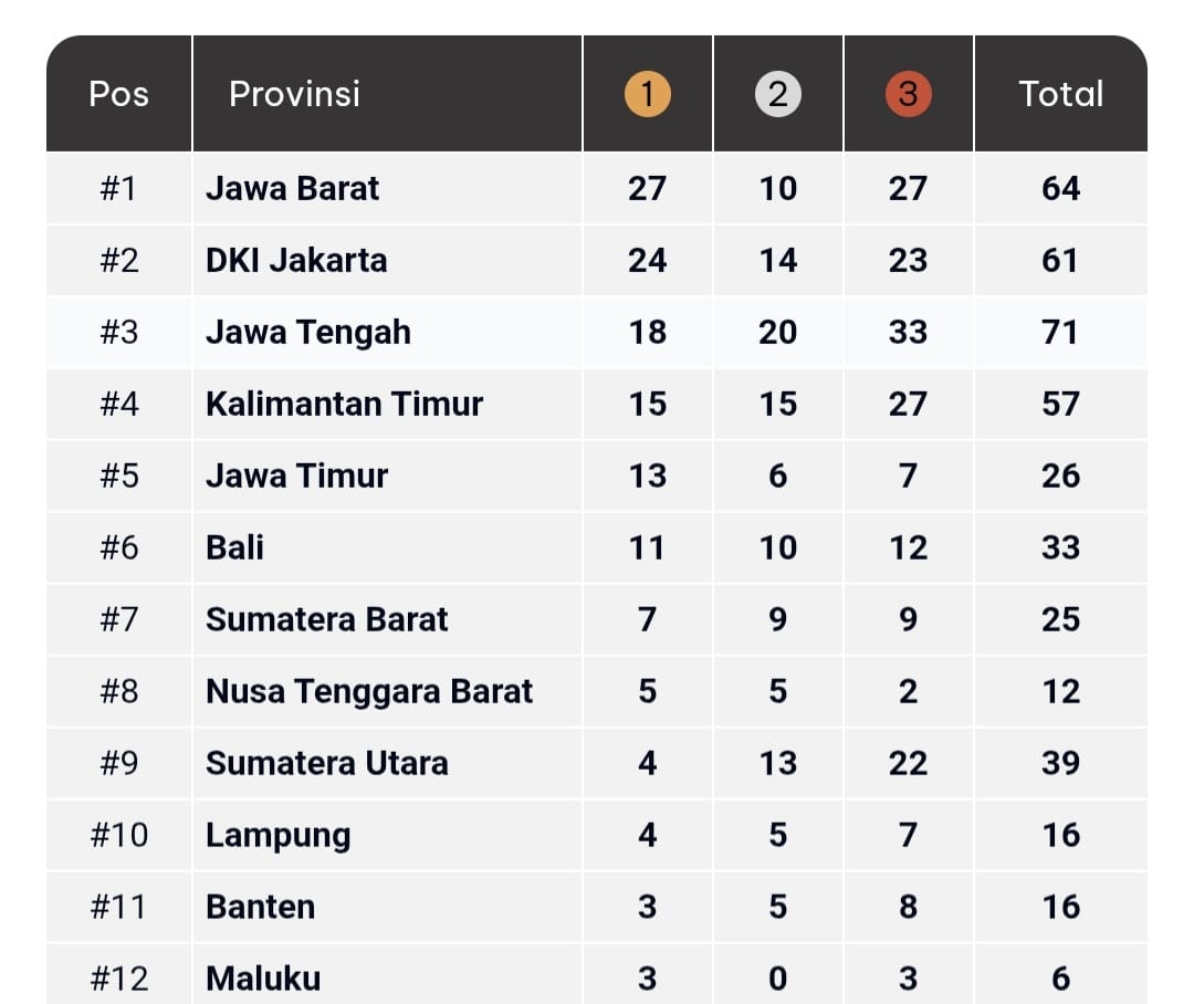 Capaian ini sekaligus menegaskan posisi Sumatera Barat sebagai raja di Sumatera, setelah sehari sebelumnya sempat disalip Sumatera Utara yang kini turun ke peringkat sembilan dengan 4 emas, 13 perak, dan 22 perunggu.