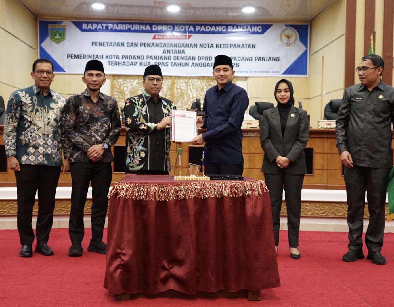 Padangpanjang,hantaran.Co–Dewan Perwakilan Rakyat Daerah (DPRD) bersama Pemerintah Kota (Pemko) Padang Panjang menandatangani nota kesepakatan terhadap Kebijakan Umum Anggaran dan Prioritas Plafon Anggaran Sementara (KUA-PPAS) Tahun Anggaran 2026.
