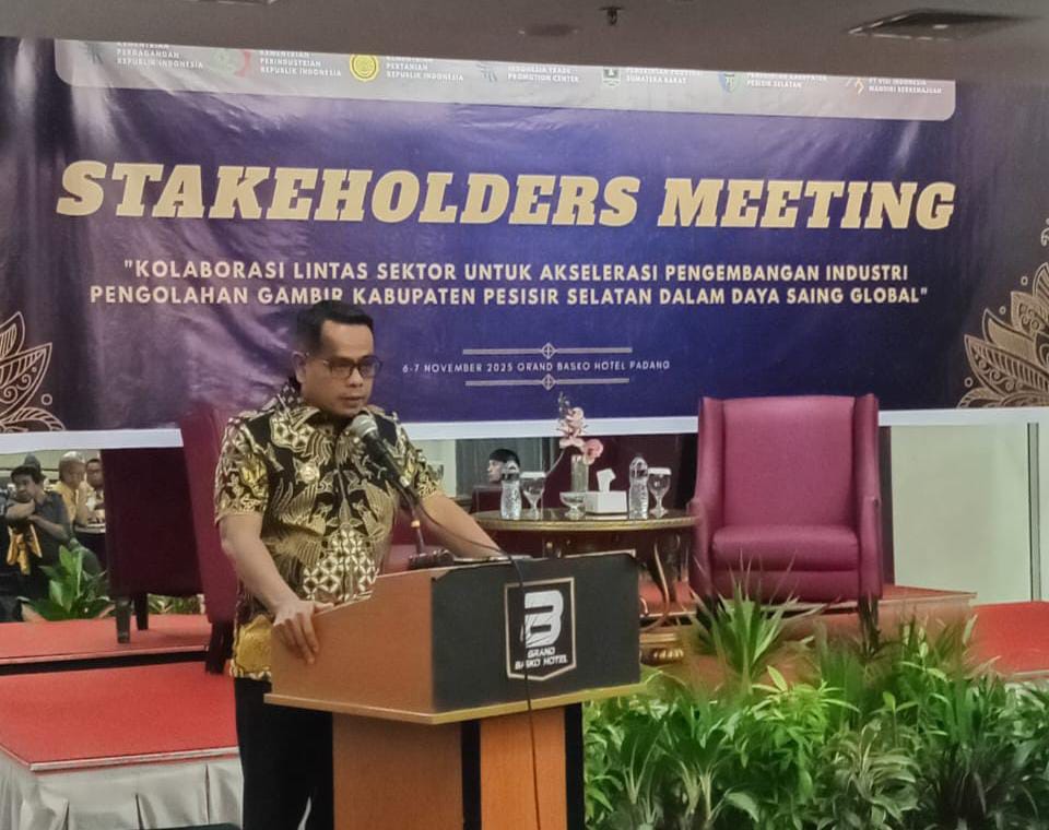Hal itu disampaikannya saat menghadiri Stakeholders Meeting di Grand Basko Hotel Padang, Kamis (6/11/2025) malam. Kegiatan tersebut turut dihadiri perwakilan Kementerian Perdagangan RI, Kementerian Pertanian RI, OPD provinsi dan kabupaten, akademisi, perbankan, lembaga keuangan, serta para pelaku industri gambir.