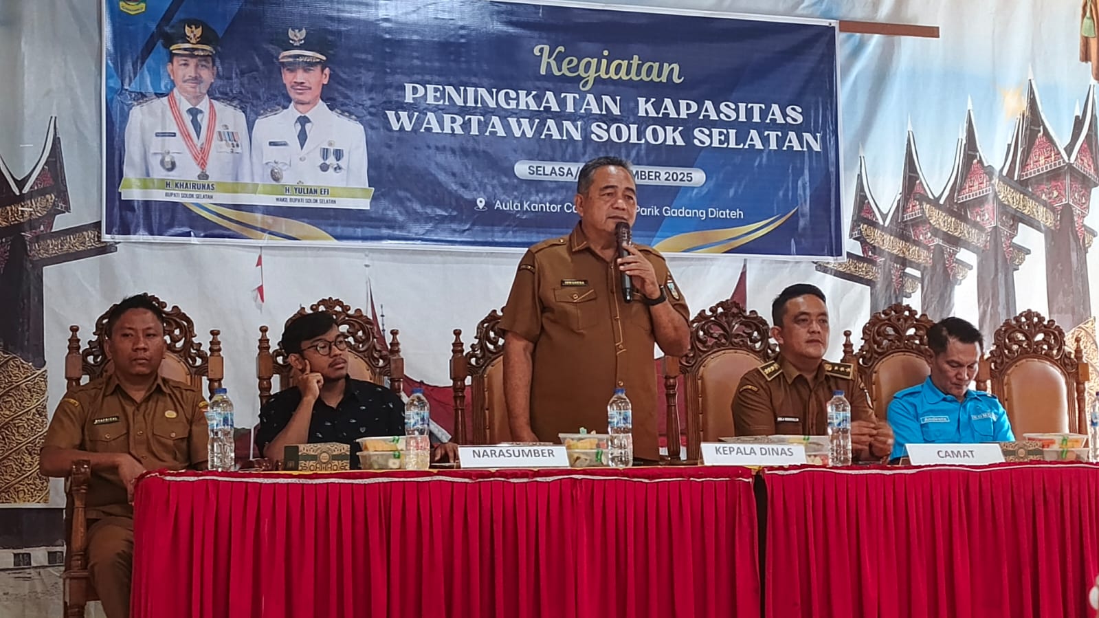 Solok Selatan, hantaran.Co— Dinas Komunikasi dan Informatika (Diskominfo) Kabupaten Solok Selatan (Solsel) menggelar kegiatan Peningkatan Kapasitas Wartawan pada Selasa (11/11/2025) di Aula Kantor Camat Koto Parik Gadang Diateh. Kegiatan tersebut dibuka secara resmi oleh Pelaksana Tugas (Plt) Kepala Diskominfo Solok Selatan, Irwanesa.