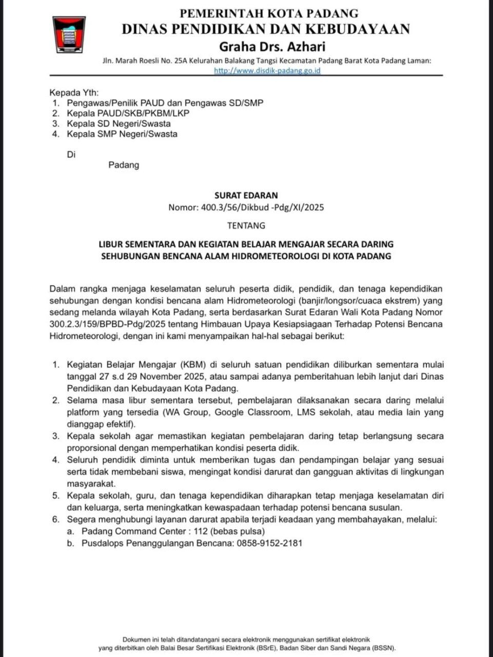 Keputusan meliburkan aktivitas KBM tersebut tertuang di surat edaran Dinas Pendidikan dan Kebudayaan Kota Padang Nomor: 400.3/56/Dikbud -Pdg/XI/2025 Tentang Libur Sementara dan Kegiatan Belajar mengajar Secara Daring Sehubungan Bencana Alam Hidrometeorologi di Kota Padang.
