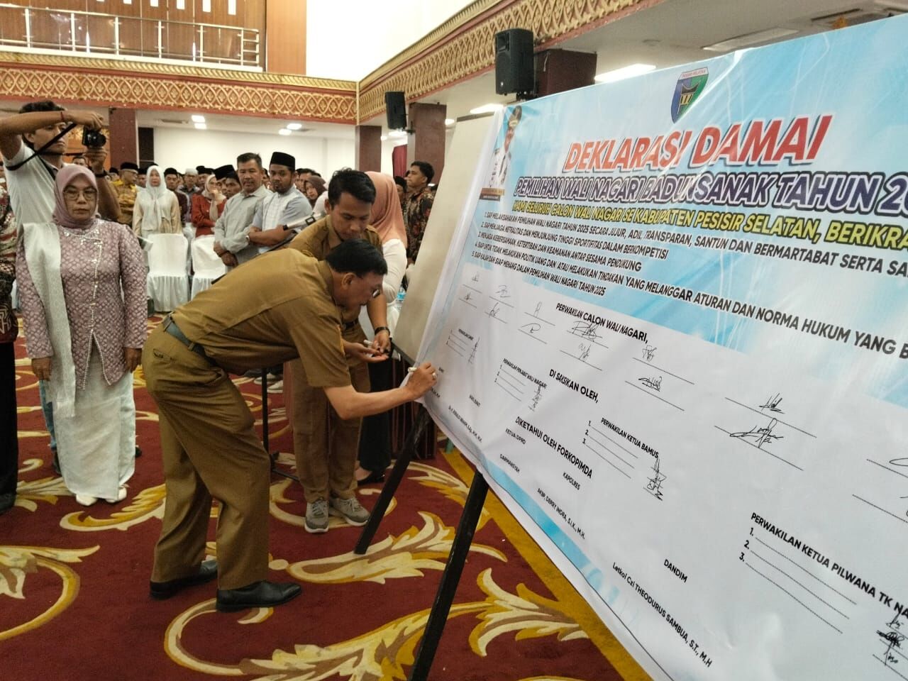 Pessel, hantaran.Co— Bupati Pesisir Selatan Hendrajoni menegaskan bahwa Pemilihan Wali Nagari (Pilwana) Badunsanak 2025, harus menjadi pesta demokrasi yang menjunjung tinggi rasa persaudaraan dan nilai kemanusiaan. Pesan humanis itu, ia sampaikan dalam Deklarasi Damai Pilwana di gedung Painan Convention Center (PCC), Senin (8/12/2025), yang dihadiri ratusan calon wali nagari dari 58 nagari se-Pessel.